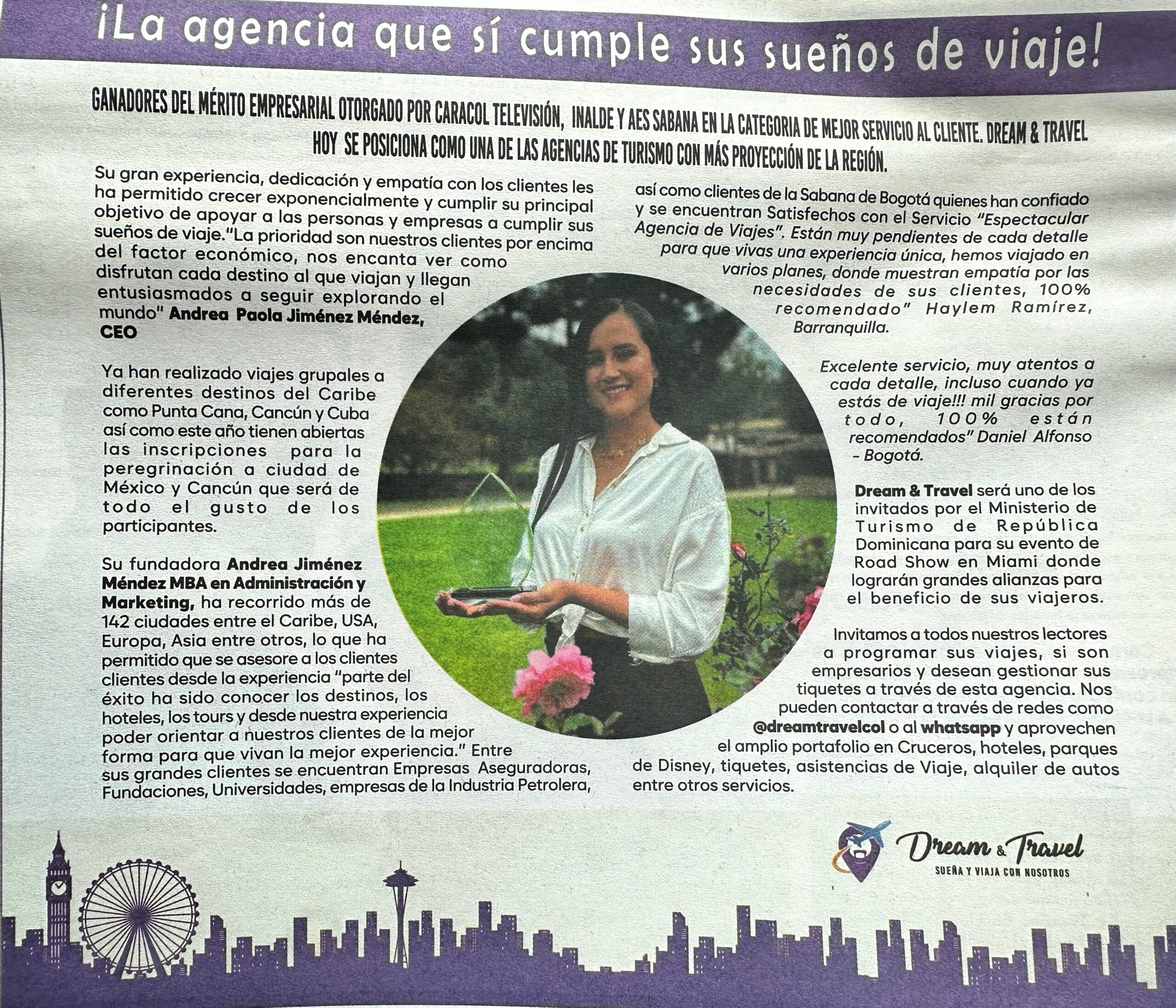 Nuestra agencia ha sido galardonada por Caracol Televisión, INALDE Business School y AESABANA por la excelencia en el servicio al cliente. Además, contamos con certificación oficial Disney obtenida directamente en Orlando USA, certificación de Universal Studios y reconocimientos del Ministerio de Turismo de República Dominicana, respaldos que fortalecen nuestro compromiso contigo.
